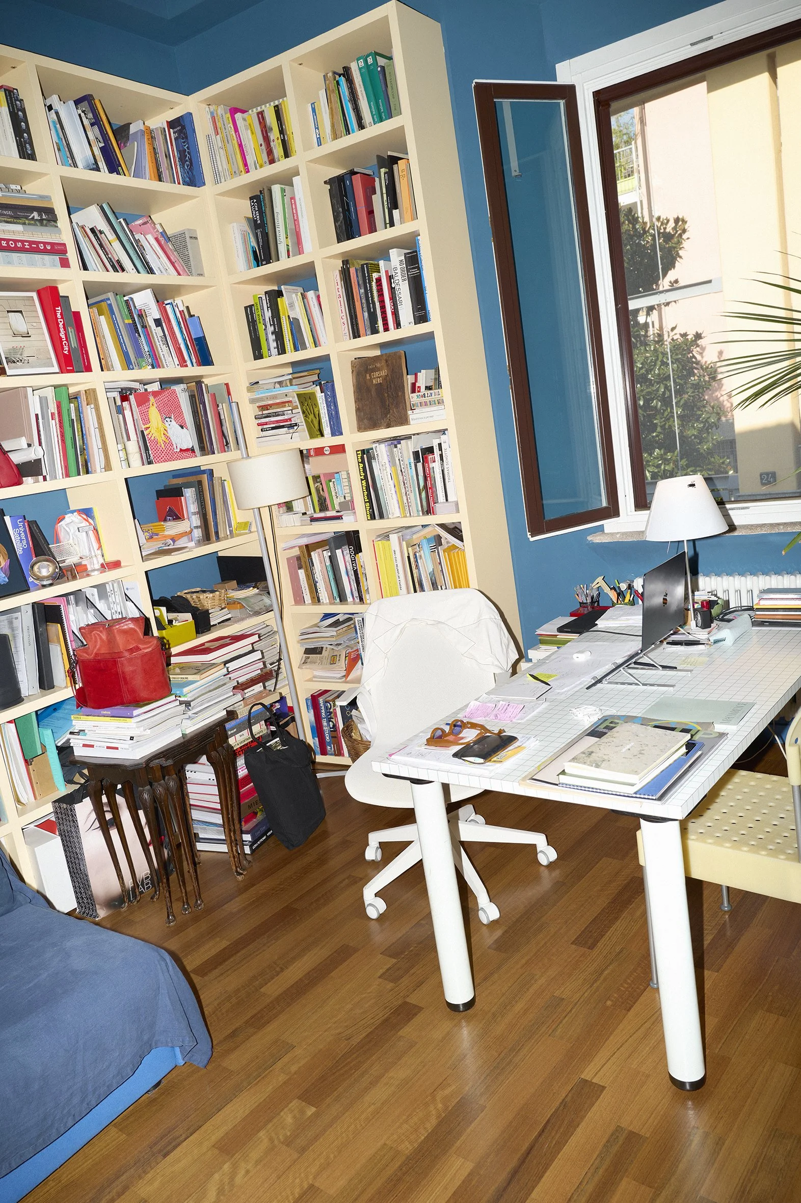 Alla scrivania, anche se in realtà non vorrei. Però soprattutto per il tema delle call passo tanto tempo lì. Però c'è una finestra da cui si vedono gli alberi; quindi, spesso le persone in call mi vedono che ho lo sguardo più alto e guardo oltre perché guardo gli alberi